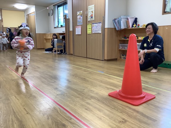 今日は運動会の練習を4クラス合同で、開会式から種目順に通しで行いました。うさぎ組さんのリレーでは、一生懸命走る姿にお兄さん・お姉さんは「かわいい♡」とすっかりメロメロ。「転ばないようにがんばれ~!」と元気よく応援していました。幼児組は、個人種目の流れの確認を重点的に行いました。披露する前にみんなマイクを使ってクラス名と名前と目標を発表する時間があるのですが、これがとっても緊張するようで、「何を言うんだっけ?」と頭が真っ白になってしまう姿も見られましたが、「〇〇組の○○です、〇〇に挑戦します」と頑張って言うことができました。本番はさらにたくさんの観客がいるので今日以上に緊張してしまうかもしれませんが、子ども達を信じて温かく見守ってあげてください。うさぎ組は、自分たちの出番のあとは屋上に行き、トランポリンや滑り台で身体を動かして遊びました。