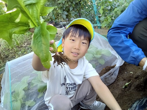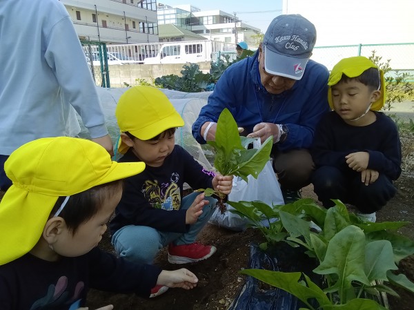 今日は3クラス合同で、公園へ散歩に行きました。【のぞみチーム】と【スーパーカーチーム】に分かれて、最後のリレー練習を行いました。保育者が声をかけるとすぐに自分のグループに移動して、【のぞみチーム】はビブスを着たりアンカーの子はたすきを身に付けたりと、とてもスムーズに準備することができました。入場してスタート地点に着くと、その場で駆け足しながら真っ直ぐに並ぶことにも慣れてきました。リレーがスタートすると、走っている友だちに声援を送りながらもリレーの時の約束も忘れず、スタートラインに移動したり前につめることができた子どもたち。両チームとも頑張り、途中で追い抜いたり追い抜かされたりと、最後は接戦となるとてもいい戦いになりました。結果は【のぞみチーム】の勝利となりましたが、負けてしまった【スーパーカーチーム】もとてもいい表情をしていました。その後は少し自由遊びをしてから、きりん組・ぞう組は畑へ行き【ほうれん草の収穫】をし、ぱんだ組は保育園に戻って【パラバルーン】の練習を行いました。