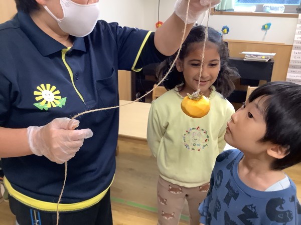 今年も去年に引き続き渋柿を地域の方から頂きました。早速干し柿作りをしようとぞう組の子ども達を誘うと大張り切り。柿の紐付けを頼むと夢中になって一つずつ丁寧に結びつけてくれました。「渋柿ってどんな味だろう?」と疑問の声があがったので、みんなで皮を舐めて味見をしてみました。「柿と同じ味だよ」と話しているとだんだん渋みが口に広がりびっくり!普通の柿との違いも知ることができました。また何故熱湯消毒をするのか、お酒を吹きかけるのかについても話しを聞き、知ることができました。