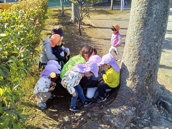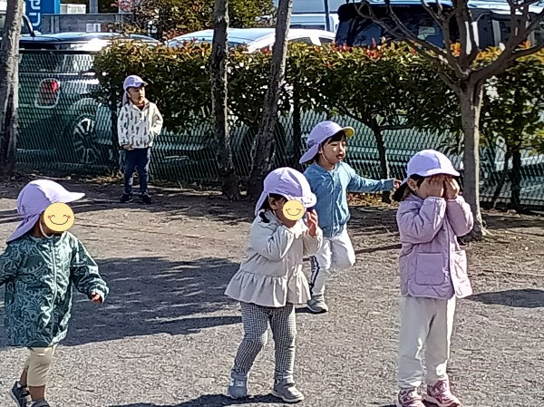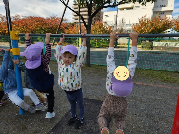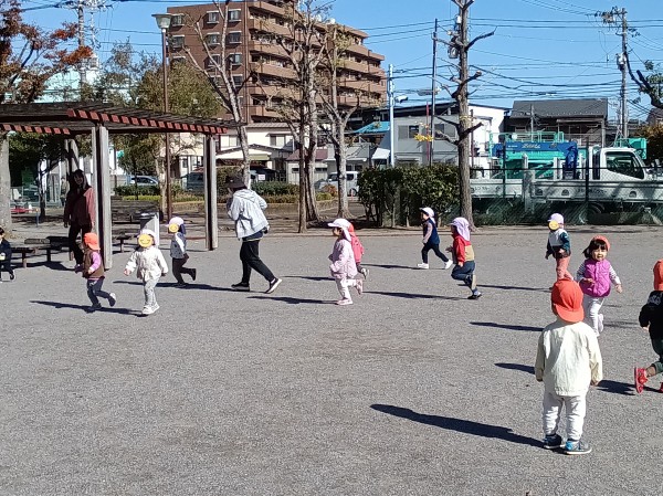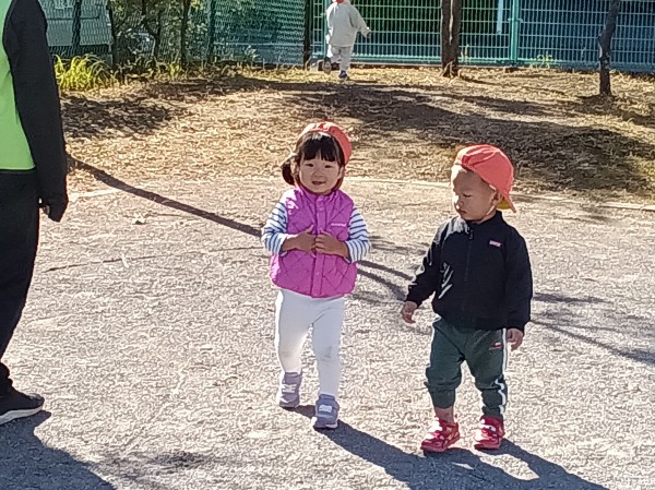 今日はりす組5名とうさぎ組一緒に公園に行ってきました。年上児が「て、つなご!」と優しく声をかけ、異年齢で手を繋いで仲よくお散歩することができました。少し緊張していたりす組さんたちでしたが、公園に着くとうさぎ組のお兄さん・お姉さんと一緒に元気いっぱいに走り回ったり、かくれんぼや落ち葉拾いを楽しんでいました。うさぎ組も負けじと「待ってー!」と元気いっぱいに走り回って、「みつけたぞ!」とかくれんぼをして遊びました。その後は砂場や大型遊具をくぐったり、登ったりして楽しく過ごしました。帰り道、りす組はもくもくと歩いていましたが、うさぎ組は「今日の給食何かな?」「お腹空いたよ!」と終始、お話が止まらずにぎやかに帰ってきました。
