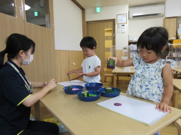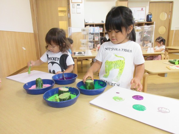 幼児組の子どもたちが育てているきゅうりとオクラが収穫の時期を迎え、豊作となっています!乳児組(1・2歳児)は沢山収穫出来たのでおすそ分けしてもらい【野菜スタンプ】をしました。