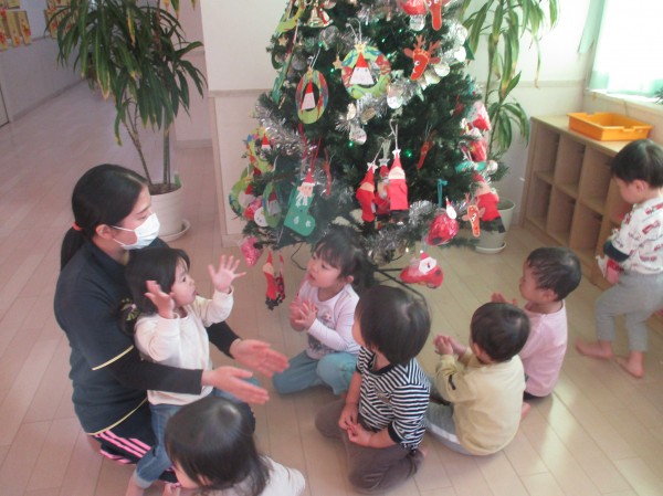 キラキラのライトや大きなクリスマスツリーで保育園もクリスマスの雰囲気で賑やかになっています。