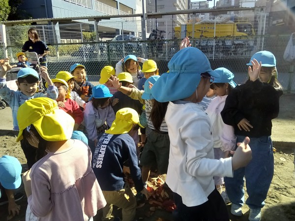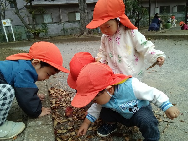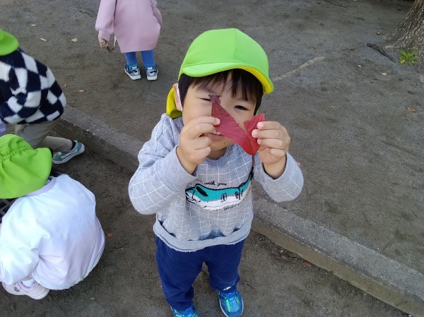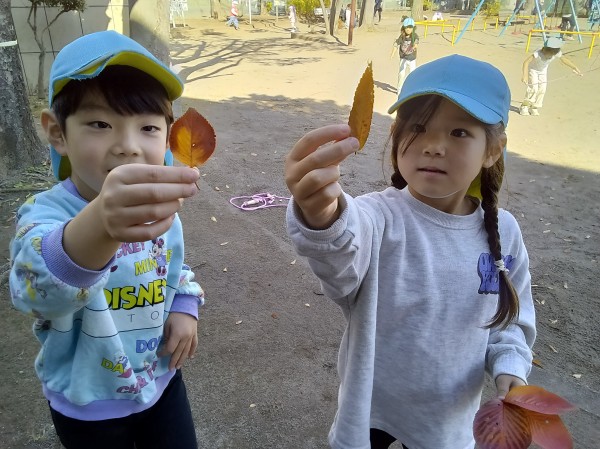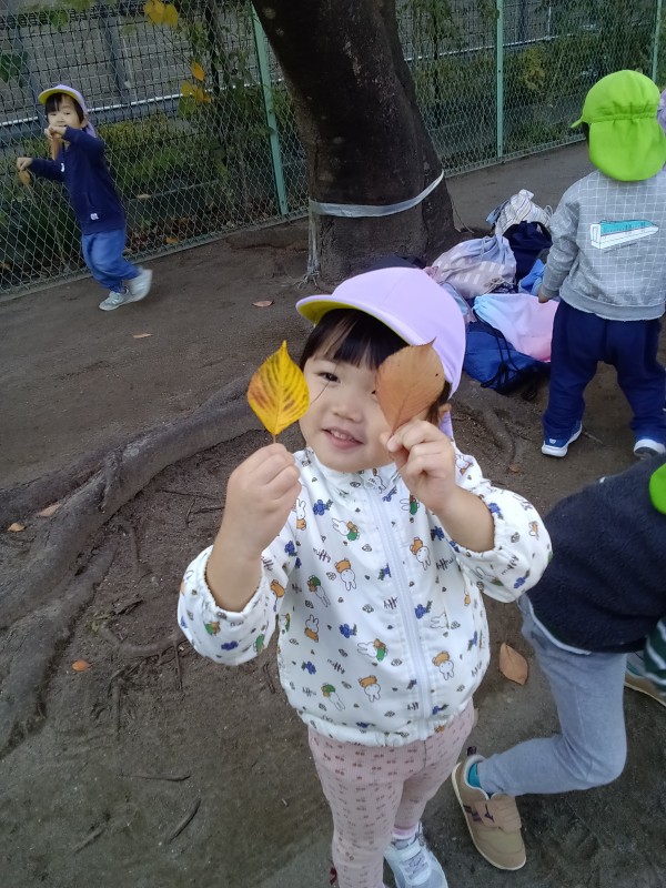 11月。保育園では、1日「紅葉狩り」の日を設け、各クラス散歩先の公園で紅葉狩りを楽しみました。