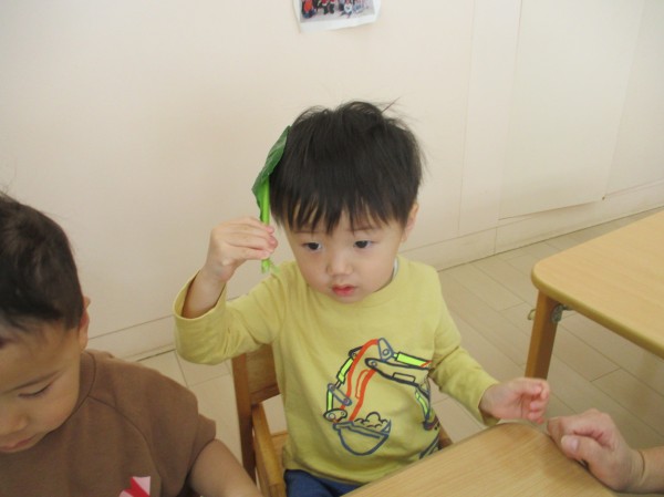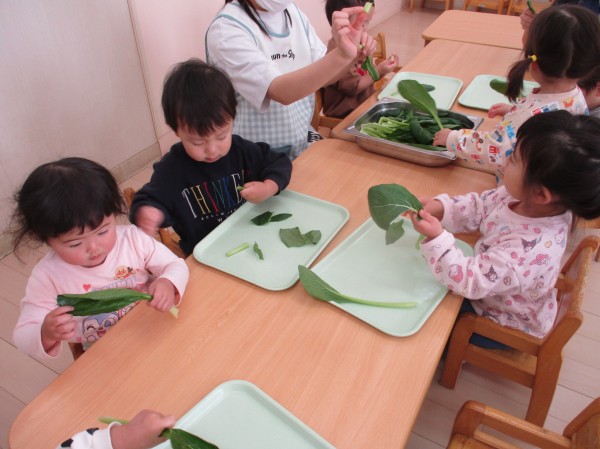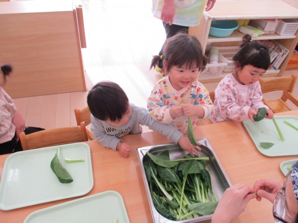 こどもの家・志木中宗岡 食育☆小松菜ちぎり あひる組(1歳)