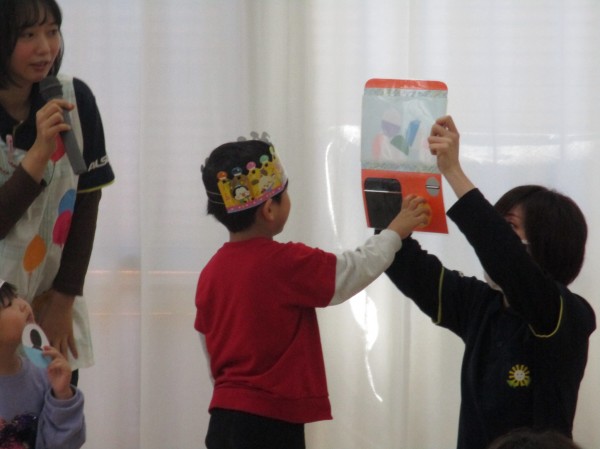 職員の出し物はガチャガチャシアター!特別に1月生まれのお友達にコインを入れてもらって回してもらいました。