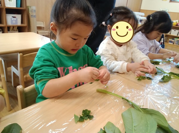 本日、うさぎ組が食育活動でほうれん草ちぎりをしました。