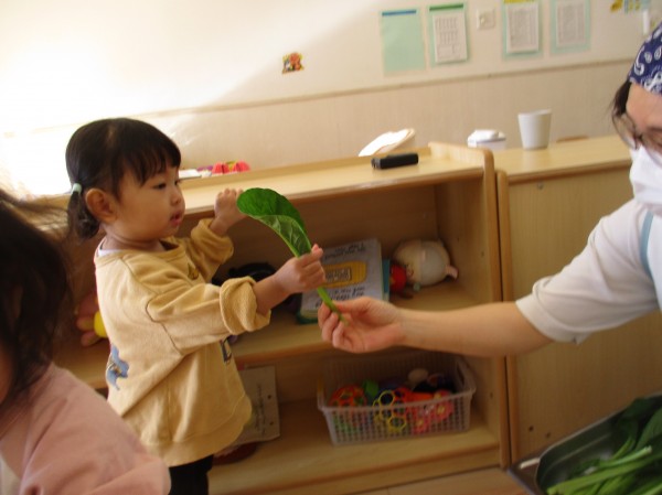 給食の先生から「”こまつな”だよ~」と言われて、持ってみる子ども達。