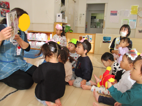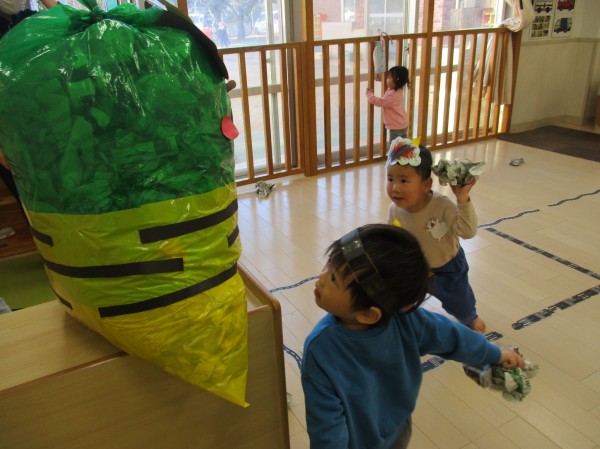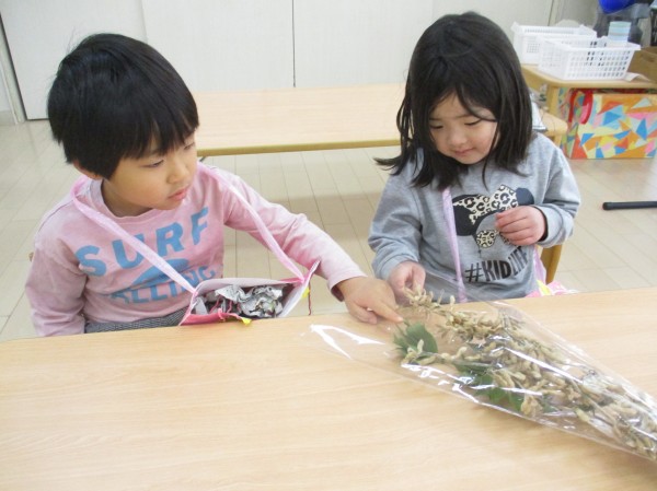 幼児組さんでは鬼の嫌いな柊のチクチクを触って、 鰯の匂いを体験してもらいました。