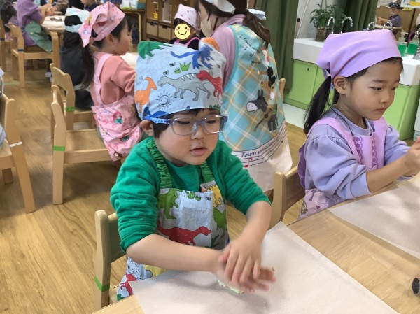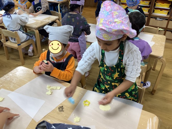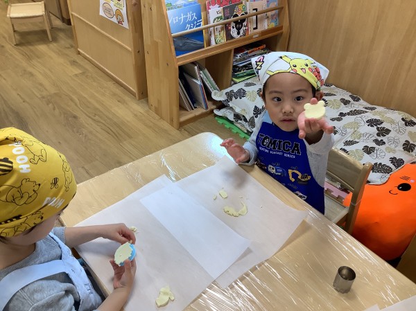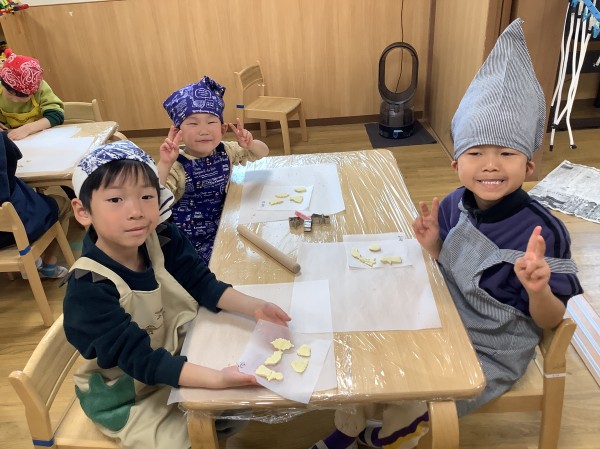 今日は食育で【バレンタインクッキー作り】がありました。朝から楽しみにしていた子どもたち。玩具の片づけ等もいつもよりも早く行うことができました。エプロン、三角巾をつけた後は、【あわあわ手洗いのうた】に合わせて丁寧に手洗いをし、準備万端。給食の先生の話をしっかりと聞き、いざクッキー作りスタートです。今日はクッキーの生地を手で広げ伸ばし、好きな形の型抜き器を使って型抜きをしていきます。一人三つくらい作れる量の生地をもらったのですが、「たくさん作りたい」と生地を薄く薄く伸ばすお友だちが多かったです。ハートはお花の他、車やクマ等の形もあり、嬉しそうにしていた子ども達。「こっちに車あるよ」「ハート貸して欲しい」と互いに声を掛け合いながら型抜き器を貸し借りし、いろいろな形のクッキーを作っていました。今日作ったクッキーはおやつの時に食べる予定です。クッキー作りの後は、公園に行き身体を動かして遊びました。