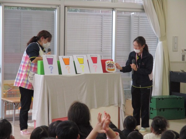 「ねぇ、何でペットボトルの色変わったの?」と聞きに来た年長さんの男の子。