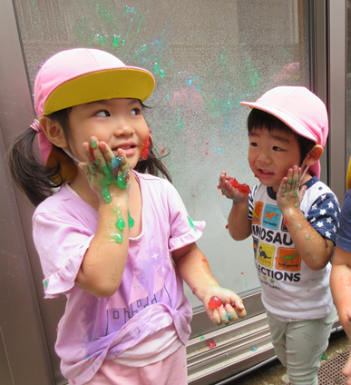 今回はペインティング~片栗粉編~の様子をご紹介します。小麦粉とは違う、スライムのような感触を楽しみながら、窓や自分の身体を使ってペインティングを楽しみました!(^^)!