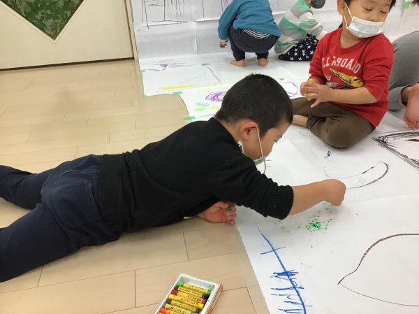みんなで描く大きな紙は、のびのびリラックスできるようで、普段は画用紙の前でう~ん"(-""-)"と考え込んでしまう子も生き生きとクレヨンを滑らせていました。またみんなで一緒に描こうね♪