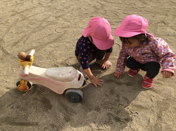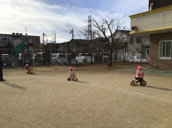 今日は風もなくぽかぽかとあたたかな園庭です。1.2歳クラスがのんびり園庭遊びを楽しんでいます。(#^^#) ちびっこライダーが走る、走る・・・