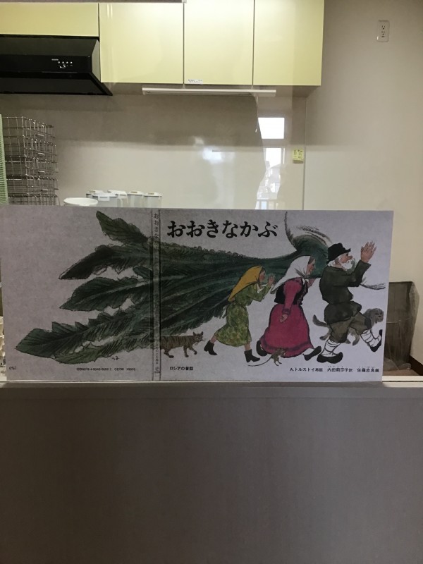 次回の絵本給食は「おおきなかぶ」有名なロシア民話です。こどもたちも大好きな繰り返しやリズム感あふれる絵本です。2/15は絵本給食の日!さくら組(3歳)が洗ったかぶで作ったシチューが給食に出る予定です。園内にはこどもたちの期待を高めるためにあちこちにおおきなかぶの絵が貼ってあります。