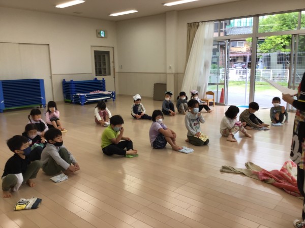 大きいクラスのお友達(3歳~5歳児クラス)は1クラスずつ遊戯室へ行き、こどもの日とはという話を聞き、菖蒲の葉を入れた桶に数人ずつ足湯を行い、最後には大きなこいのぼりくぐりを行い、こどもの日のお祝いをしました☆