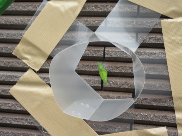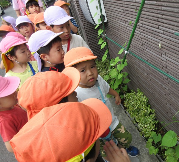 3歳児のRちゃんが「さようなら、また明日」と帰ってから5分後。「せんせー!たいへん!」と保育園に戻って来ました。保育者が「何があったの?」と駆け寄ると「先生見てみて」と手を引かれ外に出ました。すると保育園のフェンスに小さな『あおむし』が1匹くっ付いていました‼「あおむしさんが雨に濡れてかわいそうだから、屋根を付けてあげて‼」