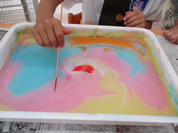 水の上で動くマーブリング液が不思議ですね。