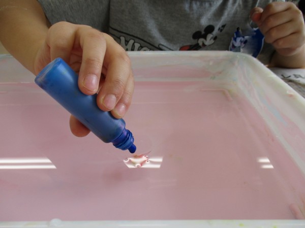 もうすぐ保育園で夏祭りがあります。ゆり組は製作する提灯の内側の紙をマーブリングで染める事にしました。その様子をお届けします(^^♪