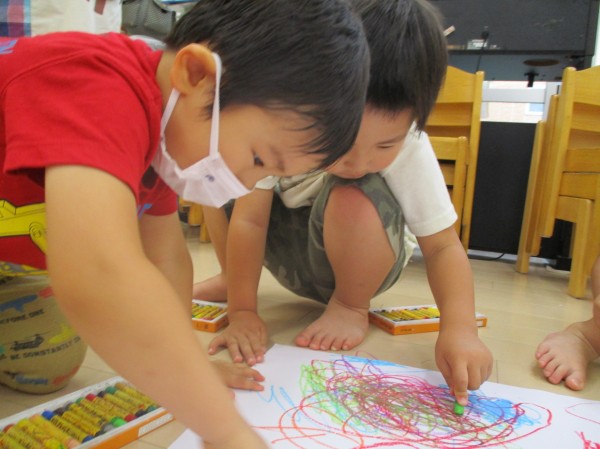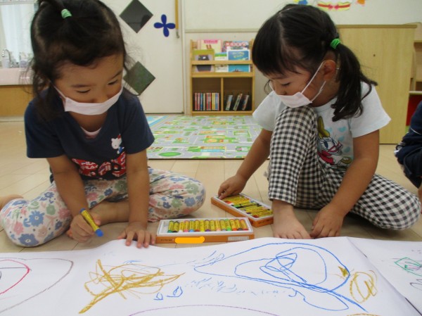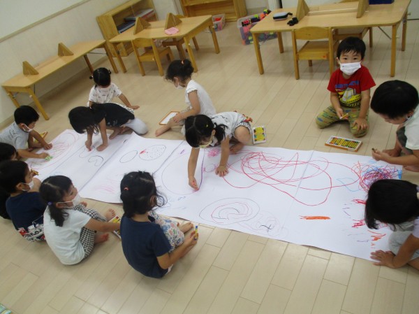本日はあいにくの雨模様・・お部屋で大きな紙に、クレヨンでダイナミックにお絵描きをしたさくら組の様子をご覧ください‼(≧▽≦)