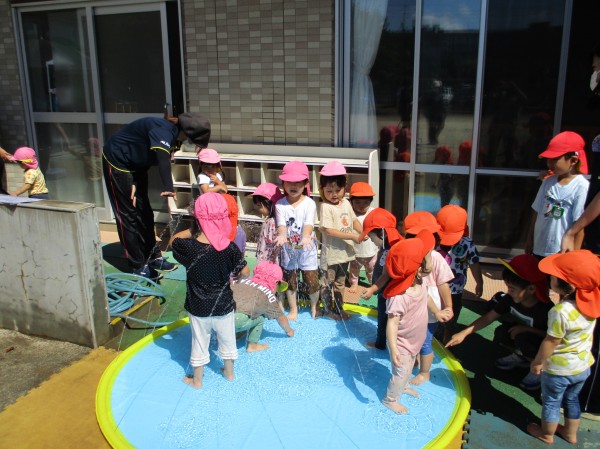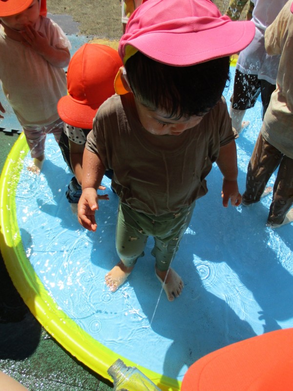 今日はたんぽぽ組とすみれ組が、新しく購入した噴水マットを使って遊んだ様子をご紹介します♪