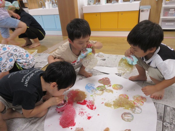 楽しさから夢中になり過ぎて床が絵の具だらけになってしまい、みんなで雑巾掛けをして後片付け‼