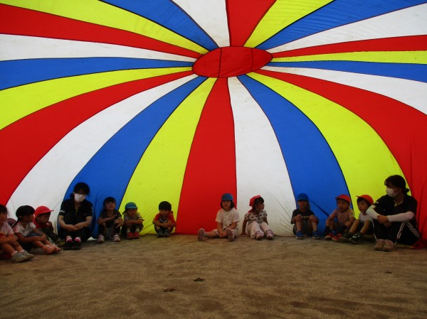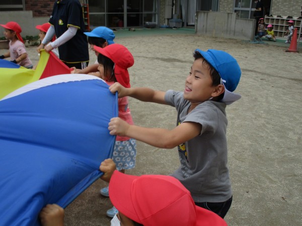 ばら組(4歳クラス)、ゆり組(5歳クラス)はパラバルーンの練習をしました。