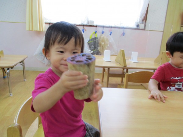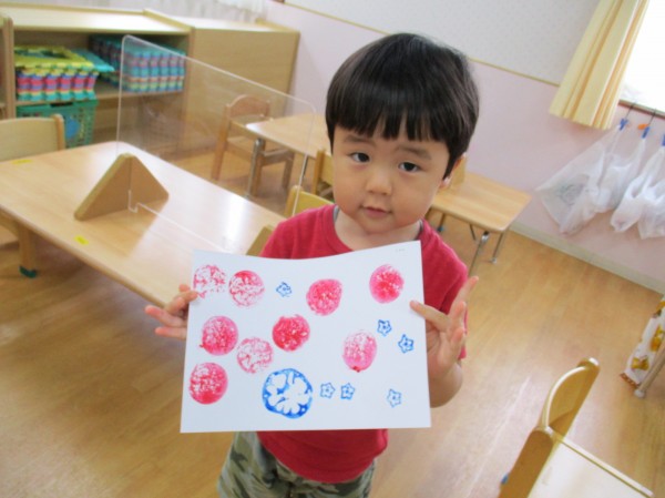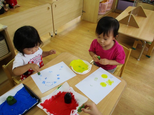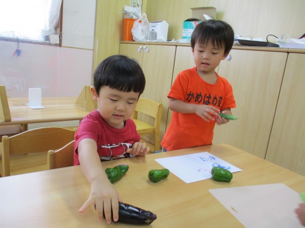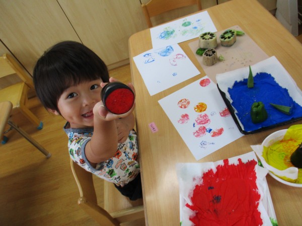 お気に入りの色を野菜スタンプにつけてチャレンジ!ナスのまんまる、オクラの星形・・・「みてみてー!」と嬉しそうに教えてくれました。