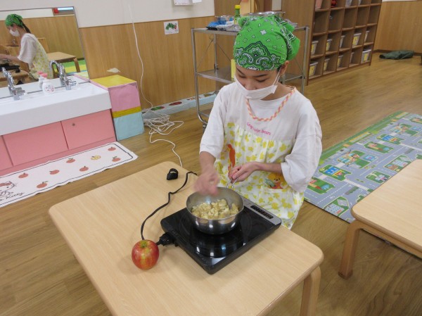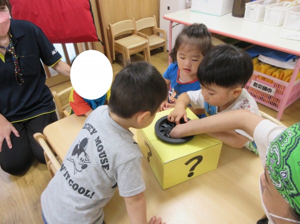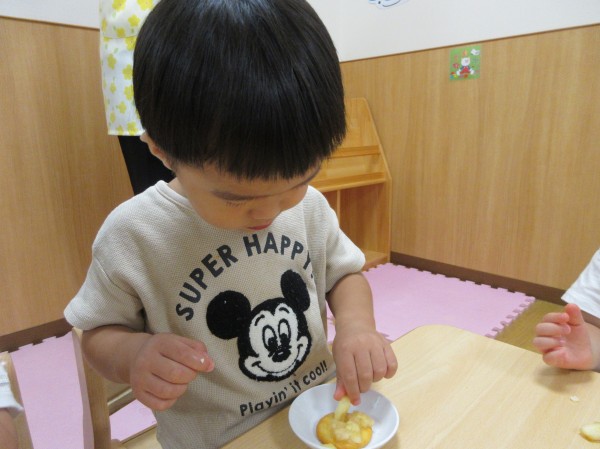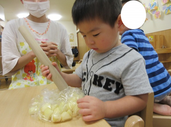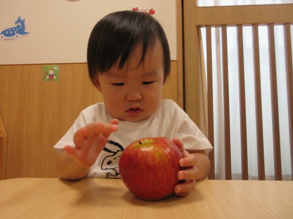 今回は1歳児の食育活動を掲載いたします。9月は「りんごジャムを作ろう」でした。❔BOXに入っている物は何だろう?と一生懸命に箱の中に手を入れて探っていました。