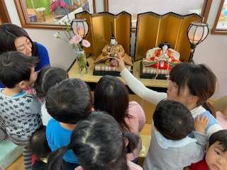 保育園の玄関にそびえたつ8段飾りの立派なお雛様の前で会は始まりました。