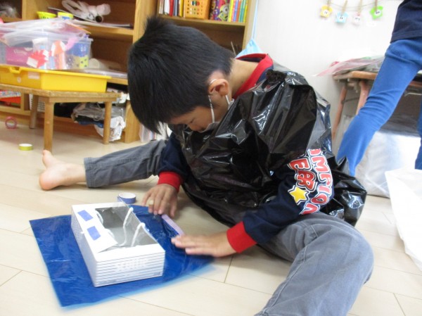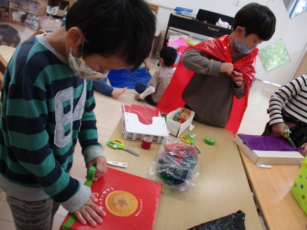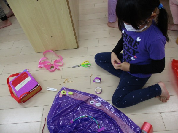 カラーポリ袋、画用紙、テープ、空き箱などを使って自由に作っていきます。