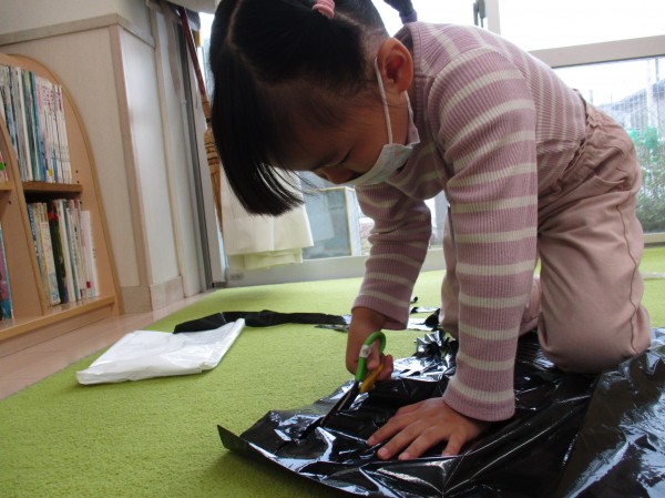 「カラーポリ袋をハサミで切るのちょっと難しい!」とドキドキ。