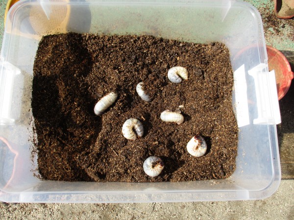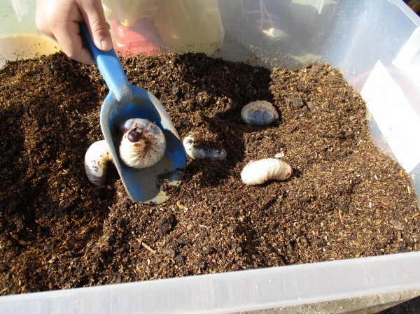 夏に育てていたカブトムシが卵を産み、幼虫になりました。
