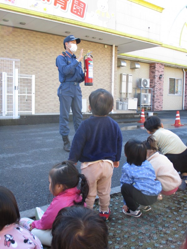 保育園で月に1回行っている避難訓練。今回は火事を想定し、消防士さんに立ち会ってもらって行いました。