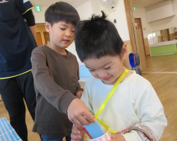 3・4・5歳児はお店屋さんごっこを行うことで、商品を作る苦労や商品を売り込む工夫、お金のやり取り等を遊びを通して学ぶことが出来ました。