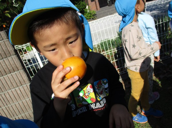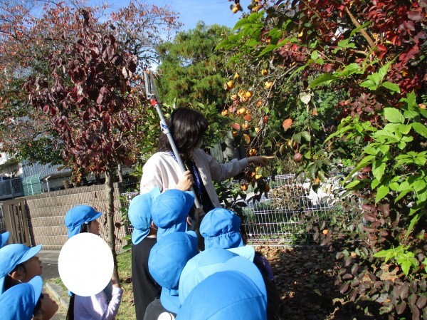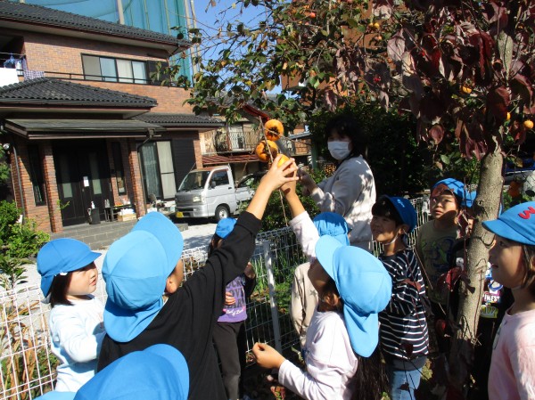 保育園には美味しそうな柿がなっていて、この日はゆり組だけ特別に柿の収穫を行いました。