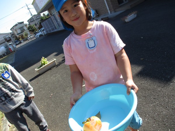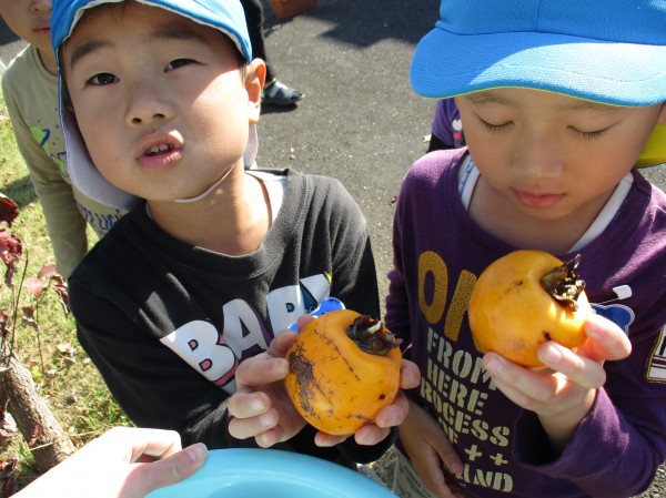 園長先生に高いところの柿を取ってもらい、一人ずつ収穫。