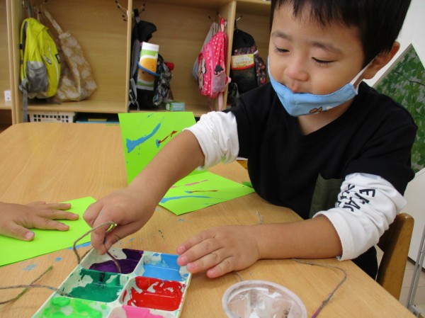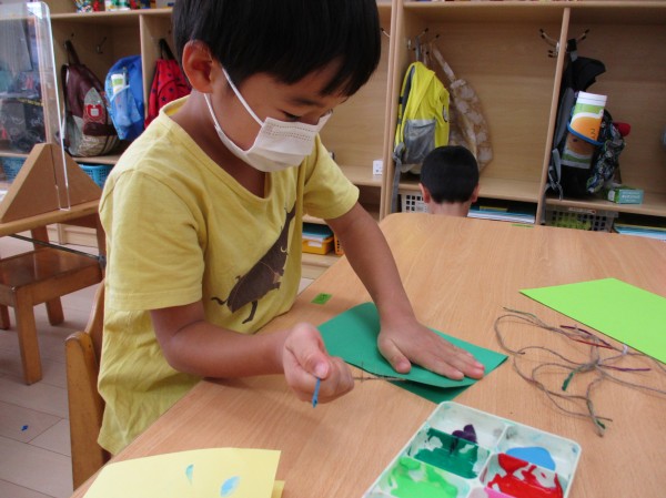 ツリーに飾り付ける、リースの製作を「糸引き絵」という技法を使って行いました!!