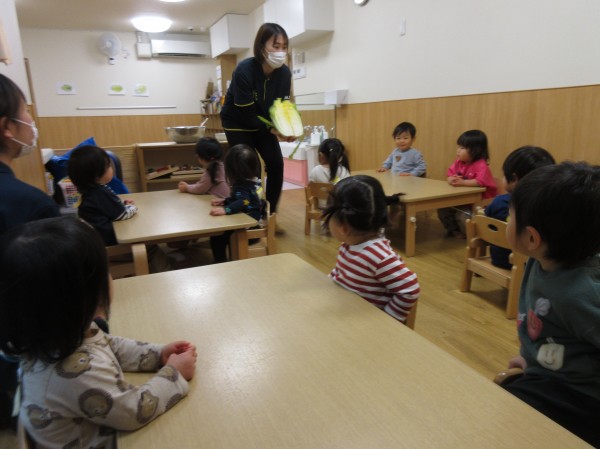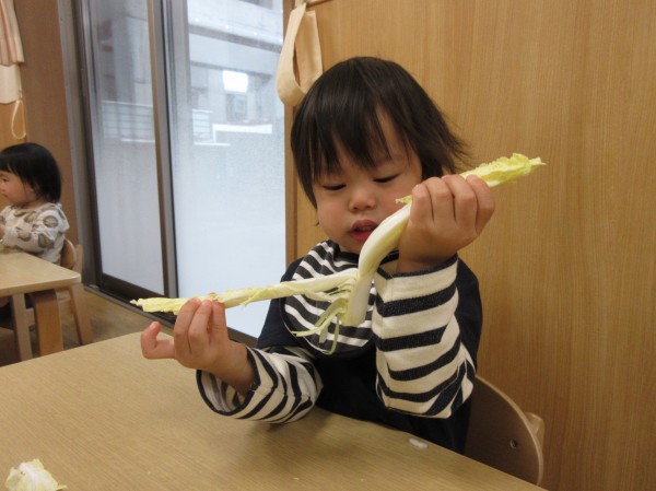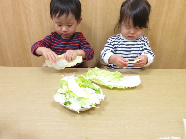 今回は1歳児りす組の白菜ちぎり、2歳児うさぎ組のかぶ洗いの様子をお伝え致します。