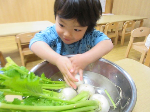 2歳児うさぎ組は、かぶを洗うお手伝いを行いました。