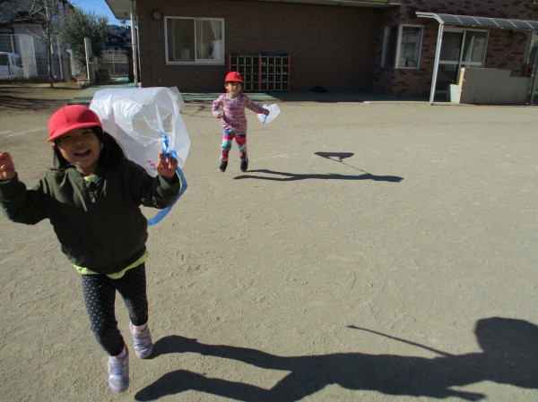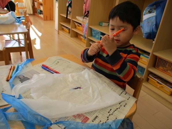 日本古来の伝承遊び・・こま、けん玉、お手玉、凧あげ・・といろいろな遊びを楽しんでいます♪その中で凧は大人気!!子どもたちと手作り凧を作りました(^^♪