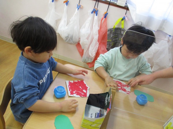 こちらはひよこ組。でんぷんのりを使って鬼の顔作り。パーツにのりを丁寧に塗って、真剣な表情です。