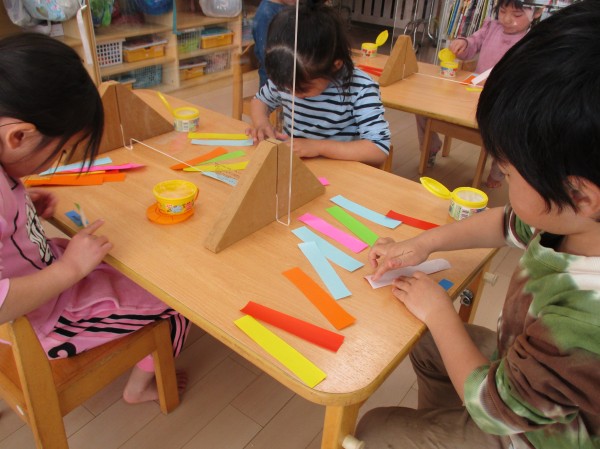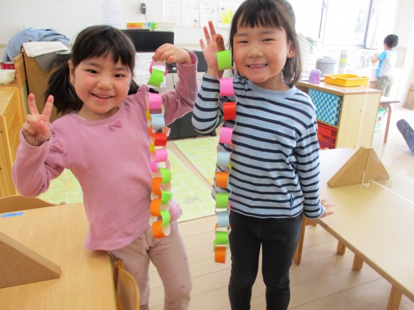 折り紙を蛇腹折りし、ちょうを作ったり、輪飾りを作ったりしました♪今日は輪飾りを作る子ども達の様子を紹介したいと思います。