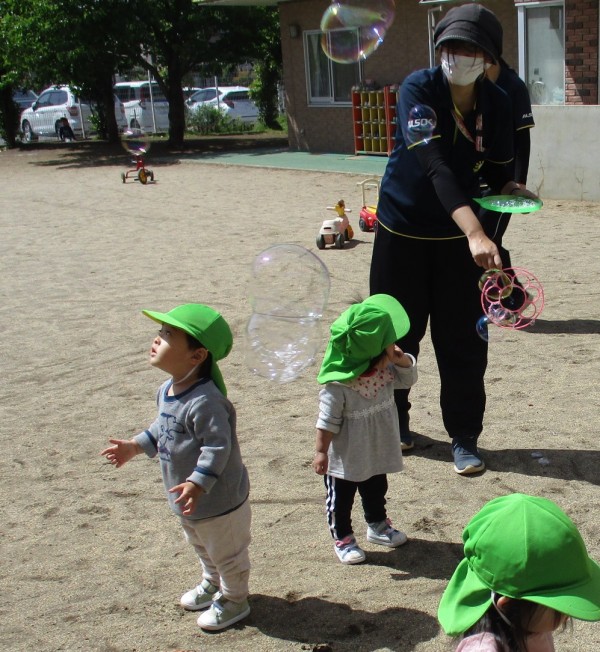 こどもの家・志木中宗岡 あひる組(1歳児クラス)園庭でシャボン玉をしたよ(^^)☆