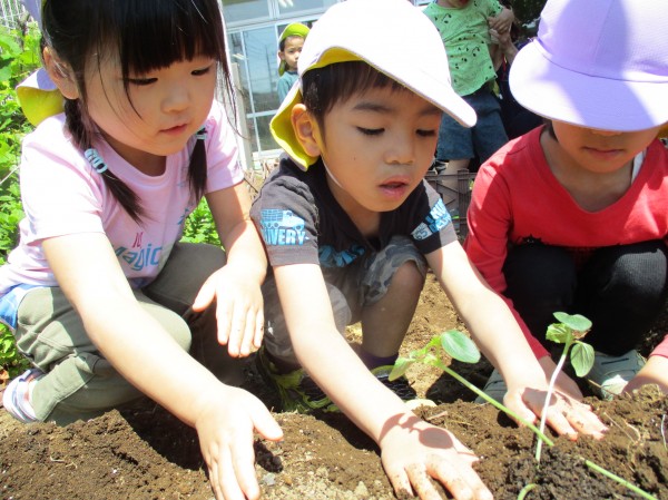 「そーっと、やさしく土をかけてあげようね」とやさしい子ども達。