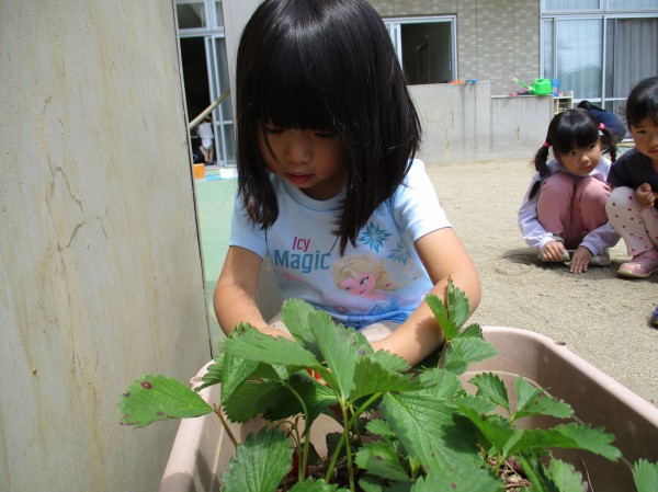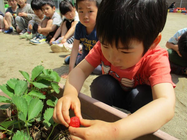 園庭のプランターに出来ているいちごを1人ひと粒ずつ選びました。