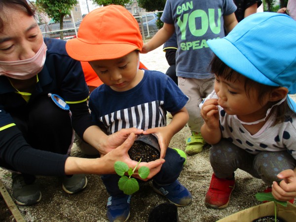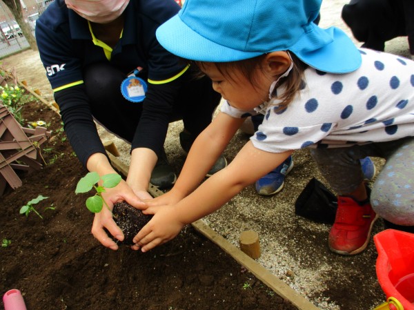 子どもの家・志木中宗岡 おくらの苗を植えました(^^♪ らっこ組(2歳児)
