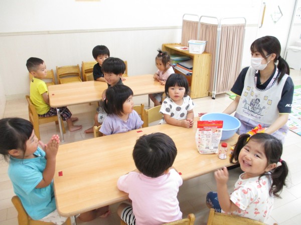 保育者が作る様子にみんな興味津々です!粘土になる前の粉にもそっと触れてみます。