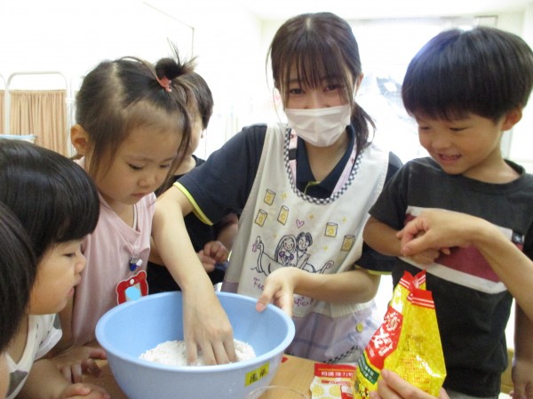 「小麦粉粘土を作るよ~」の声に、子どもたちもすぐに集まって来てくれました。サラサラの粉が粘土になるのはなんだか不思議・・・。
