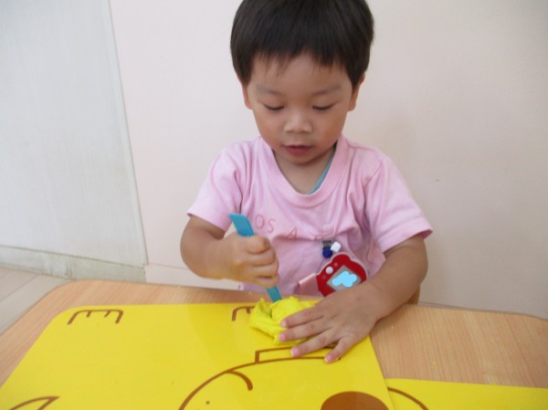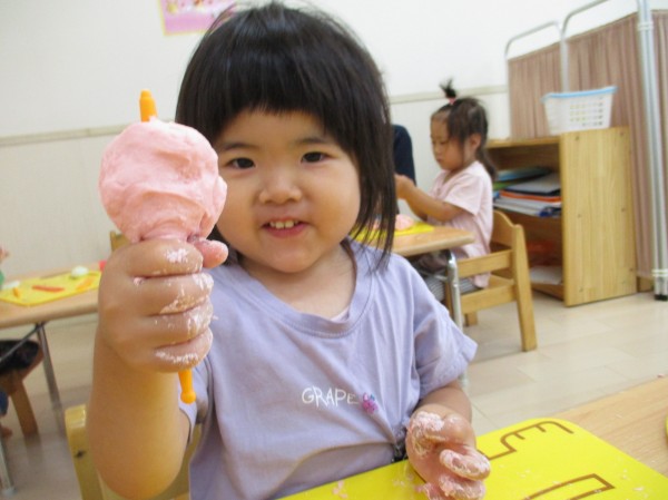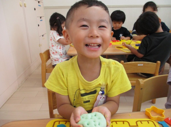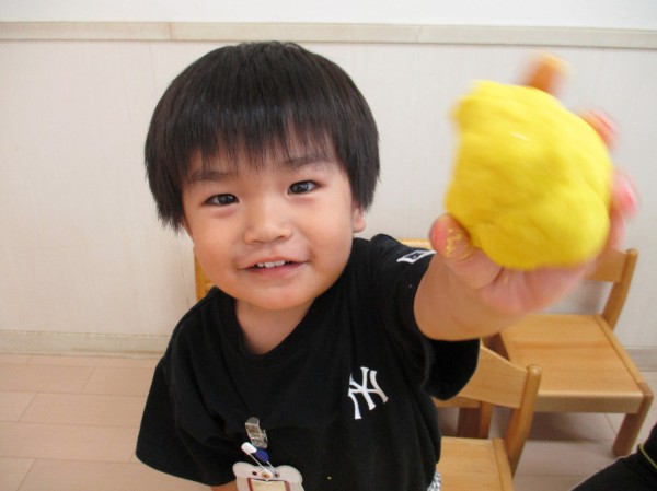 ちぎったり、こねたりに加えて、色々な形や食べ物に見立てて遊べるようになり、これから益々粘土遊びが盛り上がりそうですね。