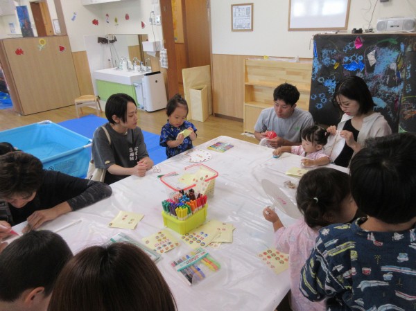 廊下や保育室の天井、壁に飾られた、子ども達が製作したたくさんの作品が出迎える中、楽しみにしていた夏祭りが始まりました。